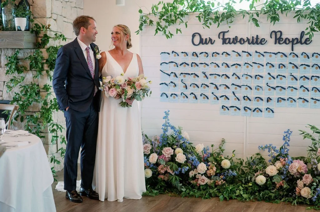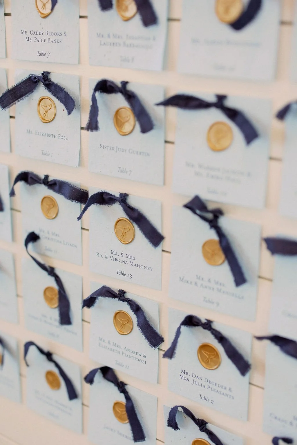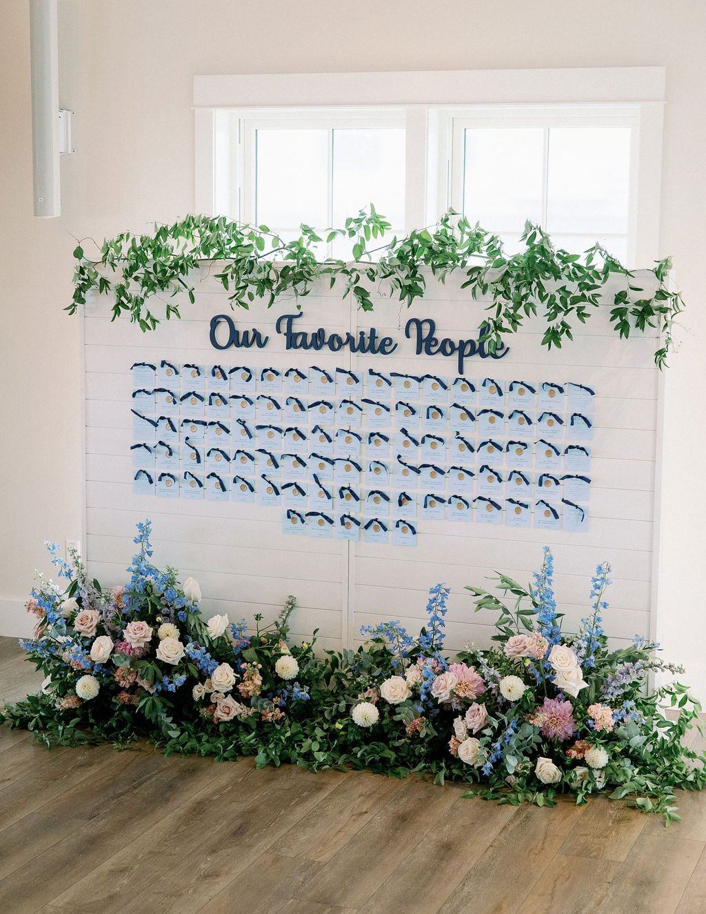 THE JOSHUA BACKDROP RENTAL // A white, shiplap-style escort card wall, adorned with a gorgeous coastal floral design and customized with plantable, wildflower paper escort cards and dimensional custom wood signage.
